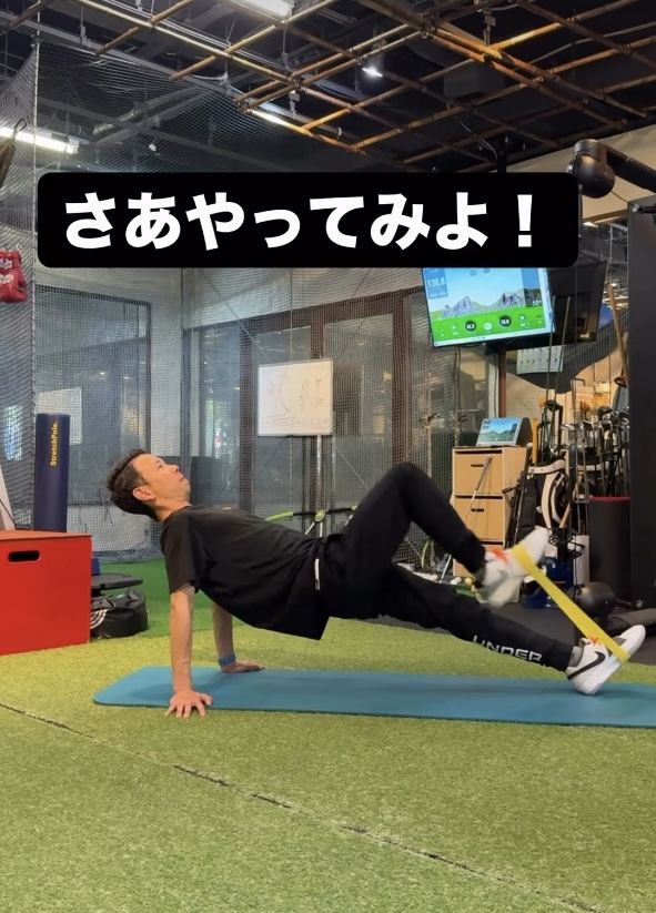 チューブの抵抗に逆らって脚を持ち上げることで、大臀筋・中臀筋など“お尻の筋肉”がしっかり目覚めます。