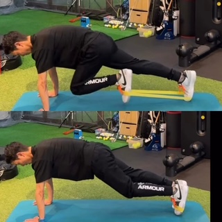 通常のマウンテンクライマーにチューブを加えると、下半身と体幹への刺激がグッと高まります。