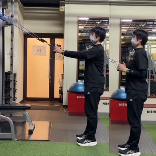 ②この種目はとにかく肘を後ろに引くことを意識して、引いていきます。最後は胸を張るような姿勢をとります。これを繰り返し行っていきます。